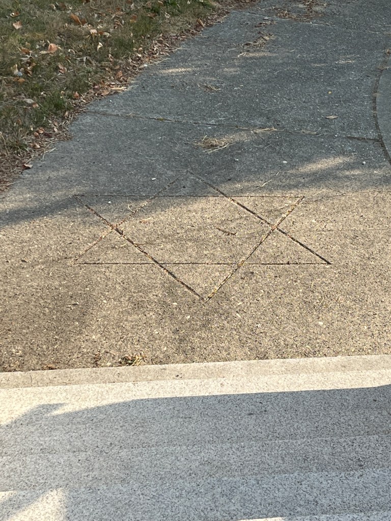 There are steps down to the ground on both sides. At the base of each set of steps is a symbol in the paving.