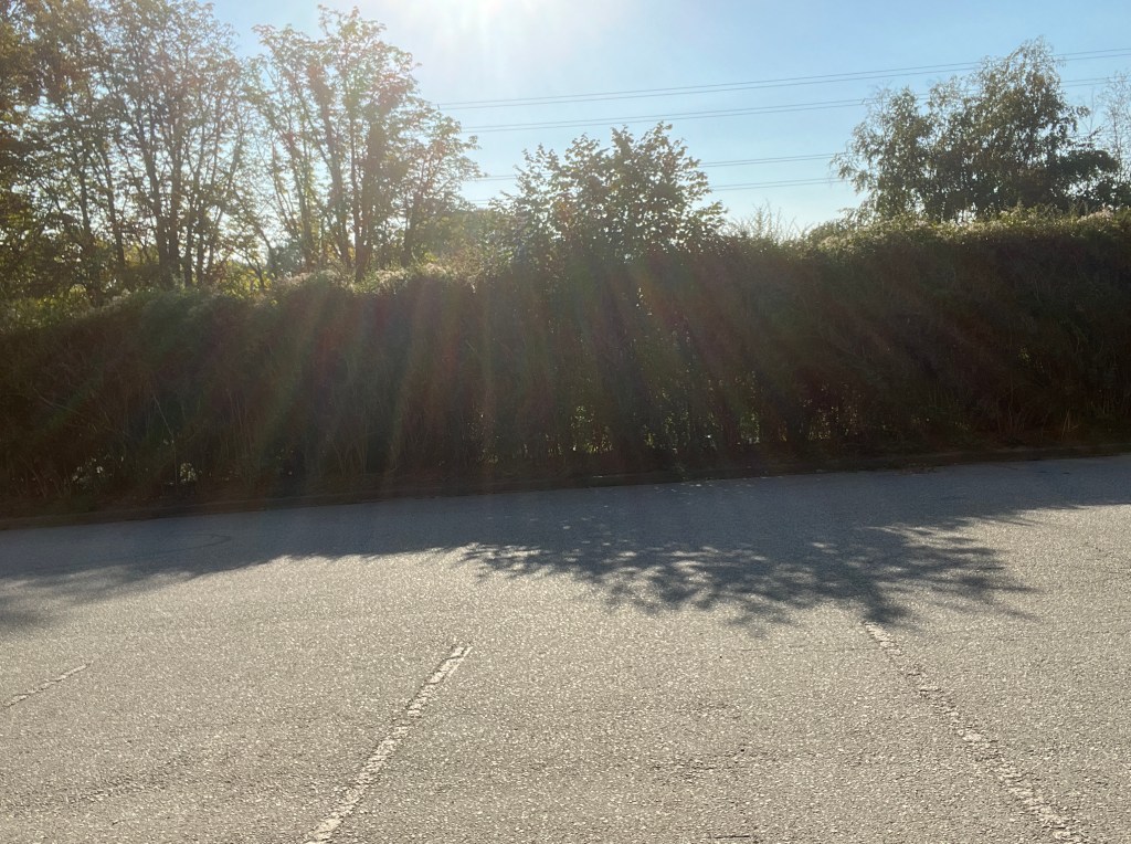The view from Circe Barracks across the narrow car park to the hedge with the Lougheed Hwy behind it.