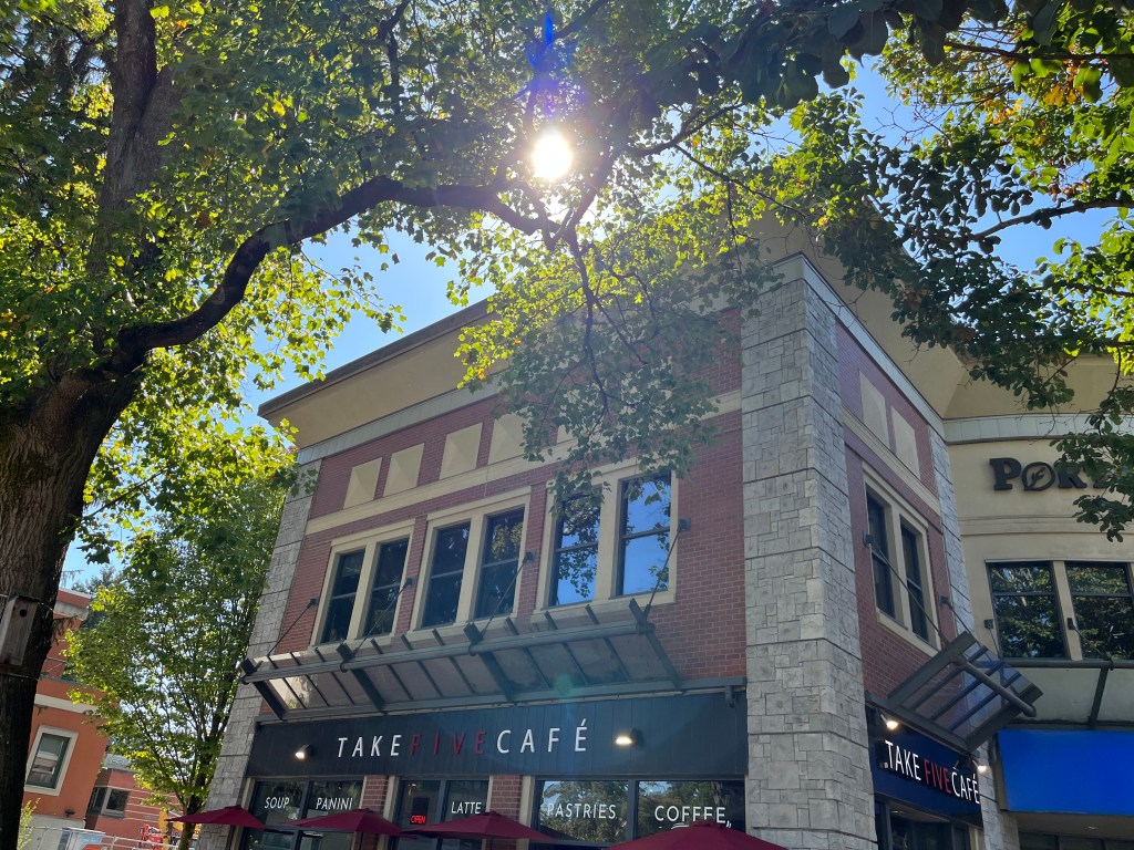 When it was filmed, the name of the café was carefully removed. I wonder of Port Coquitlam should have been removed, or was this an oversight? The names of the businesses in the street opposite were digitally removed too.