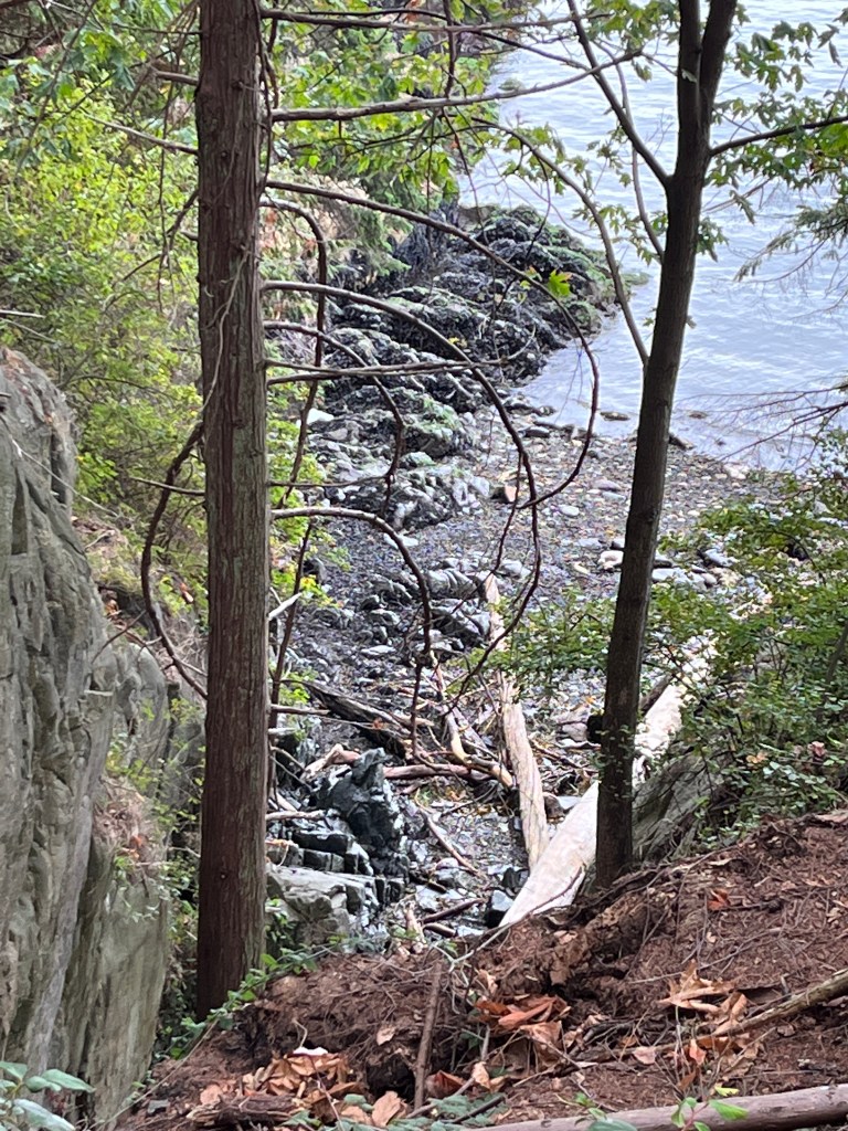 However, the beach where Abigail and Tally found Raelle is real, and the geology and vegetation matched up, so I went to hunt for that. From the on-screen filming, if it was one of the bays at Lighthouse Park, it would have to be one of the bays to the east of the actual lighthouse. So, I had a snack, drank water and set off for a climb through the woods.
