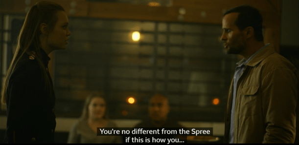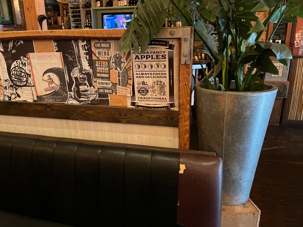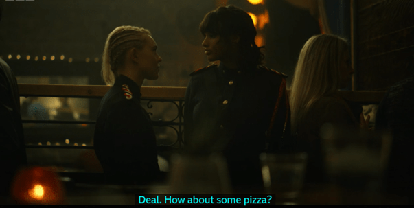 I knew from my research that they filmed at the Vault Restaurant ‘May 8 2019’ & May 9 – 11. But no more information than that, so I wasn’t exactly sure what was filmed there, it had to be something early in season 1, but there were a few possibilities. An online image search didn’t help much. My best guess was the pizza scene from 1.02 My Witches.
