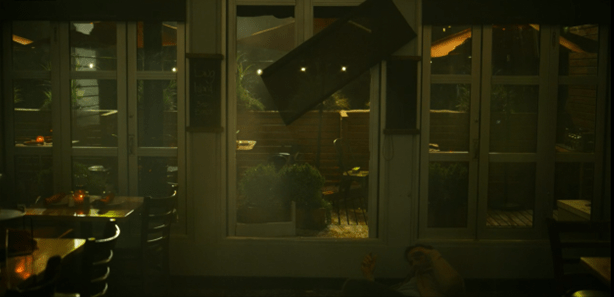 This is the real window. The patio area that we see on screen was, presumably, a safety feature to ensure that explosive debris didn’t go onto the street and endanger the locals.
