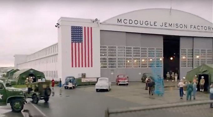 This is a behind the scenes shot from the filming of 2.09 that shows the hanger from the outside.