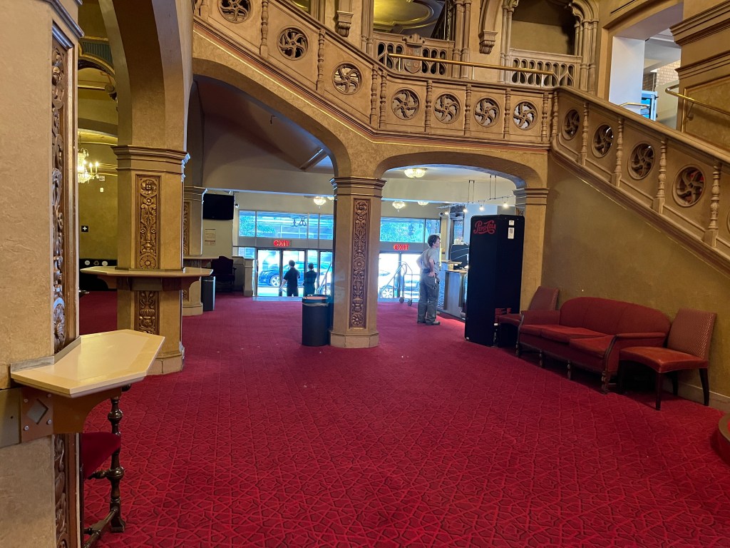 There are three entrances to the Orpheum Theatre, which was used in 2.05 for the rescue of Tiffany by Scylla and Anacostia. They entered from the inner door at the north entrance on Granville street, went up the stairs, collected their masks at the mezzanine and then took the stairs down to the foyer. You can see into the foyer and see Scylla’s staircase from the entrance in Seymour Street.