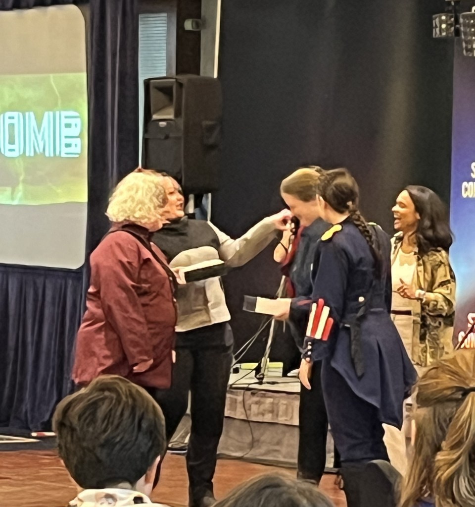The cast guests presented the prizes. This was Lyne giving the prize to Beltane Alder. Lyne said that the Beltane outfit was one of the costumes that she regretted not buying.