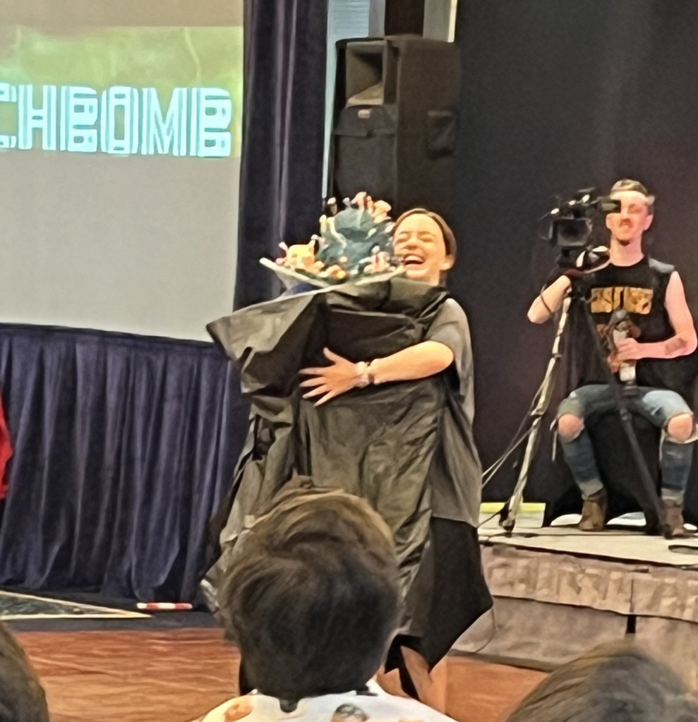 Amalia is hugging The Witchbomb. I do have to say that this was a spectacular costume, every mushroom was hand made. Sunshine, who was inside the costume, had a hilarious story that she was telling some of us in the lobby the next morning about this moment. I can’t do the story justice, as it really needs the live re-enactment. Amalia said she was going to hug her, but Sunshine couldn’t actually see Amalia because of the head of the costume and she was holding her trophy and couldn’t get her arm out through the costume liner and the mushroom ‘platform’ at the top meant she couldn’t get too close to anyone anyway. Moment of panic. But Amalia improvised brilliantly.