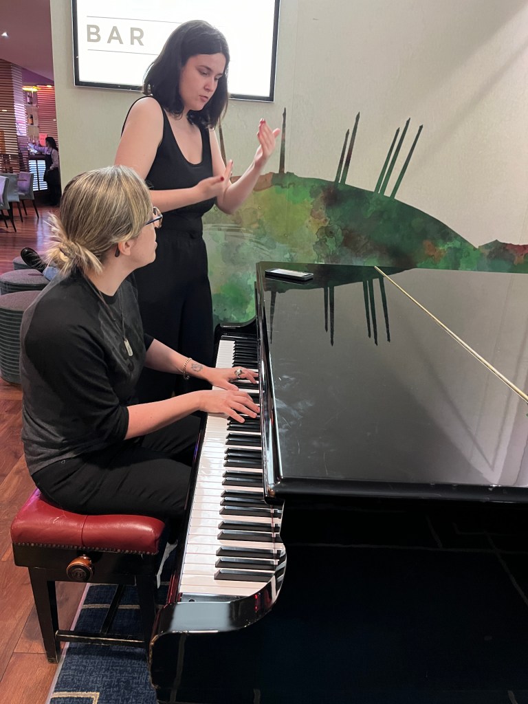 The good thing about having a professional musical theatre producer / musical director and composer in the fandom is that she was able to negotiate the use of the piano in the lobby. This is Floz and Lauren rehearsing for the Switches singalong.