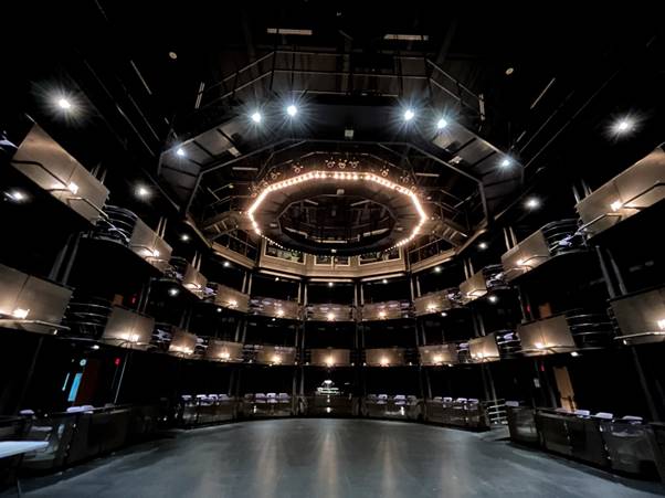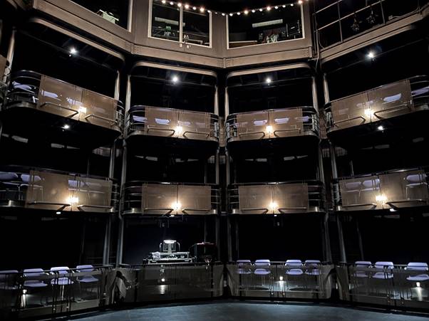 The theatre has a series of movable towers that can be moved to create different performance spaces. The way it was set up when we visited was almost the way it was set up when Motherland filmed there.