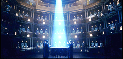 The fact that the towers are movable gave a lot of flexibility in the use of the space. We saw this in the harmonics exercise, where all the main action took place in the middle of the floor, but had space for Anacostia and her other trainers to stand out of the way and monitor what was going on. The chairs can be removed too, so the performers (soldiers) can stand at the various tiers.