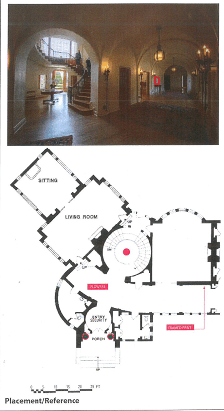 I did manage to get hold of a partial production sheet showing the layout of the ground floor to the mansion. In this plan we can see the porch and the entry security as well as what is just beyond what I could see from the porch.