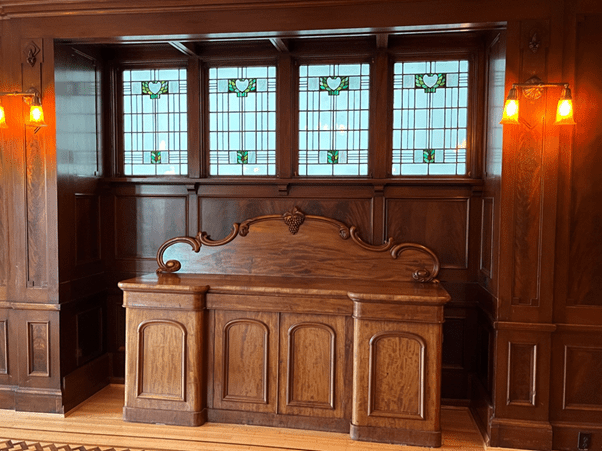 Hycroft, we were told, was used quite often as a filming location. We were taken to the main staircase. The carpet on the main staircase had been put in by the makers of the film Catwoman for Halle Berry to walk down. After the scenes were filmed, the film company had no use for the carpet, so that stayed permanently. I couldn’t resist walking down Catwoman’s stair carpet.