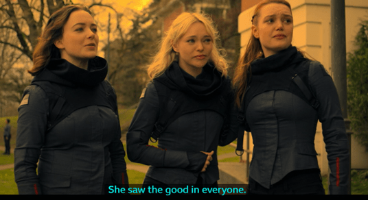 I know some people are not happy that Scylla and Adil were not in the helicopter scene. However, I don’t think they had a part to play in it. When the cataclysm happened it was Tally, Abigail and Raelle who played pivotal parts in it. Tally and Abigail as stewards, singing their part of the song and Raelle with the Witchbomb sending their message all round the world. Then Raelle healed Adil and Scylla. This storyline started with the unit and ended with the unit. Adil and Scylla would still be there when the Bat landed back at Fort Salem.